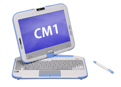 The CM1 has been specially developed to be commercialized for educational purposes by Intel, which promotes ICT[1] education on a global basis, and by Toshiba, which has technologies and expertise for notebook PCs. The monitor rotates 180 degrees and has a touch screen LCD that supports pen input, allowing students to practice handwriting. The PC also has a handle to make it easy to carry around at school.